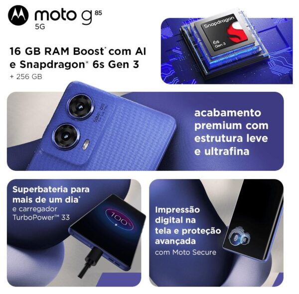 O celular ainda traz duas câmeras traseiras: com 50 MP e 8 MP; e a frontal com 32 MP. O Motorola Moto G85 tem 5.000mAh de bateria e conta com “recarga rápida” de 30W.